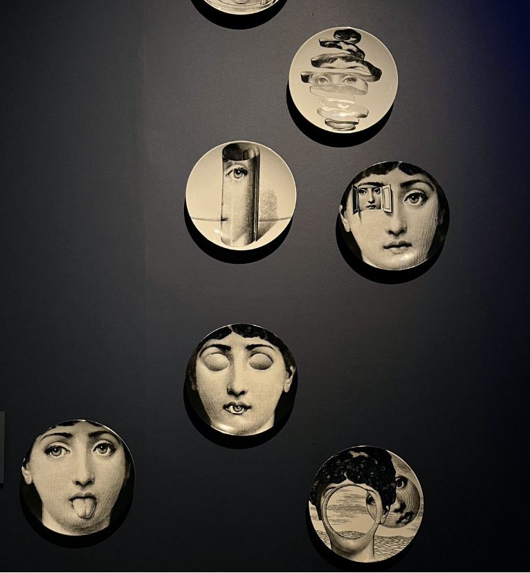 I piatti di Fornasetti, invece, ci portano in un viaggio nel mondo dell’immaginazione, con l’ossessiva variazione sul tema del viso di Lina Cavalieri, una cantante d’opera dell’Ottocento.