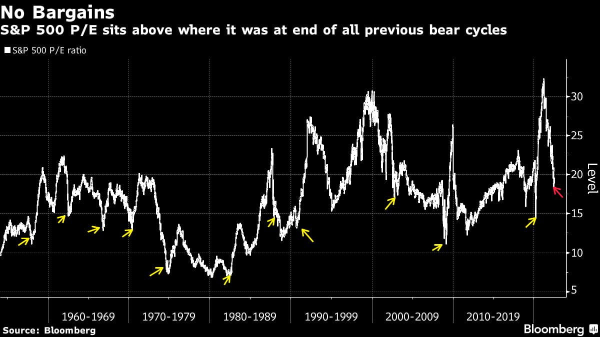 Per quanto riguarda il principale indicatore sulle valutazioni, il P/E ratio medio raggiunto nel punto più basso di giugno, vedeva il prezzo delle azioni dell’S&P 500 a quota 18 in raporto agli utili. Se questo fosse davvero il bottom, si tratterebbe del fondo caratterizzato dalle azioni “più costose” mai visto dagli anni Sessanta ad oggi.